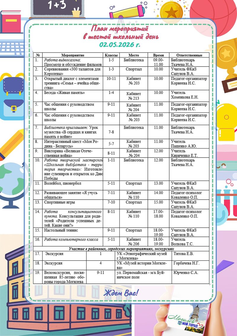Режим работы государственного учреждения образования «Средняя школа № 1 г.Могилёва имени Т.Р. Карпинской»